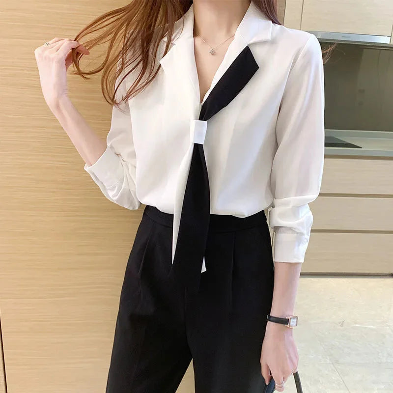Women Spring Autumn Style Blouses Shirts Lady Casual Long Sleeve Notched Collar Bow Tie decor Blusas Tops
