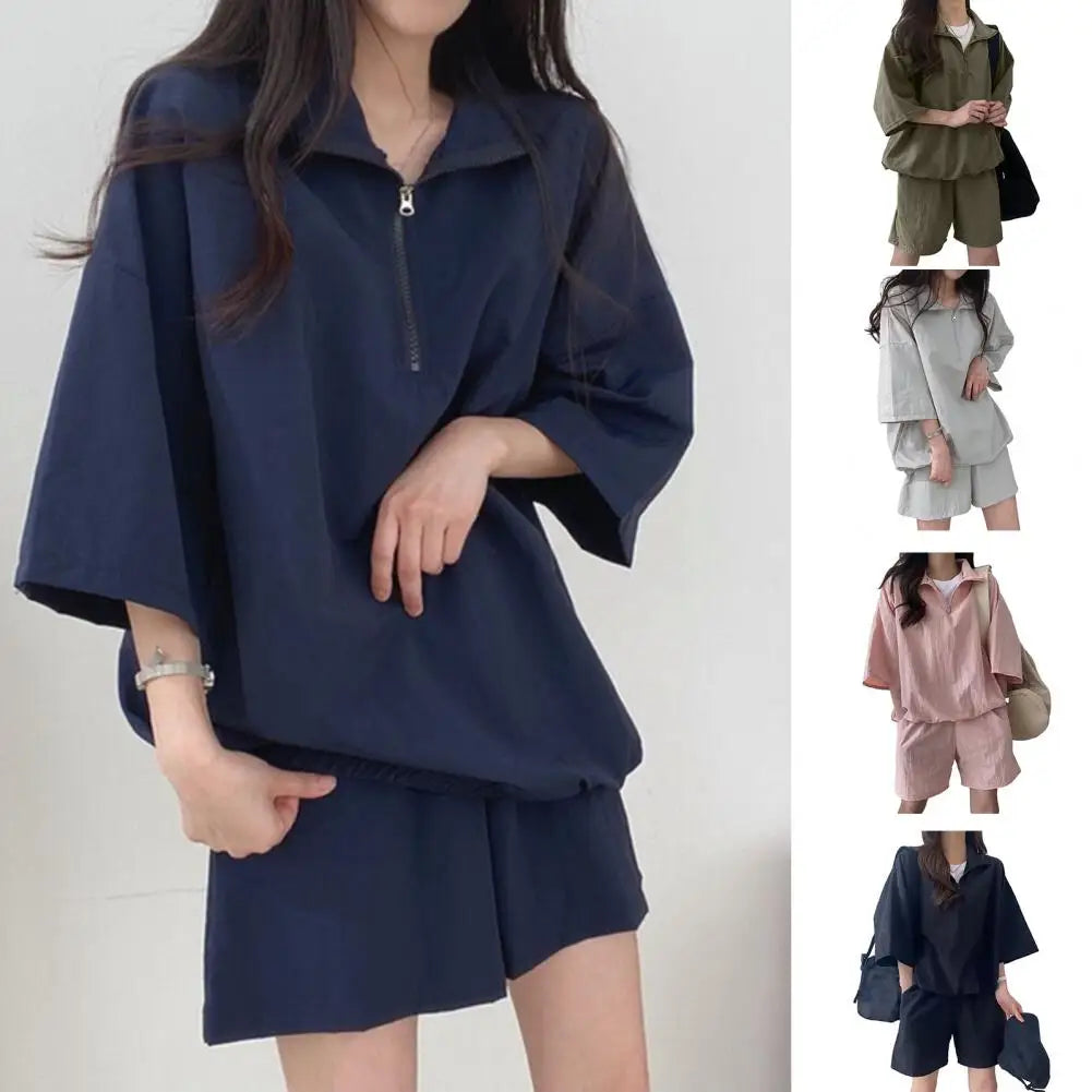Ladies Summer Suit Women's Oversized Tracksuit Set with Zipper Neck Pockets Loose Solid Color Top Shorts Combo for Female