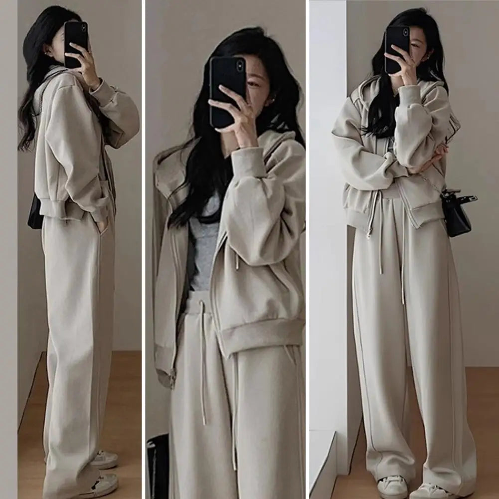 Lady Autumn Tracksuit Winter Sportswear Tracksuit Set with Hooded Jacket Wide Leg Pants for Women Plush Lined Coat
