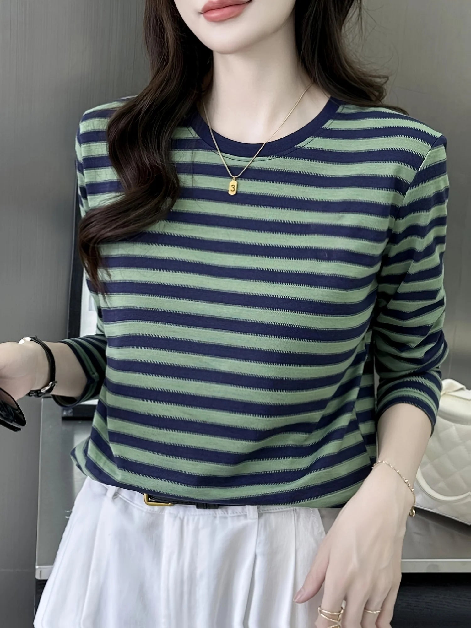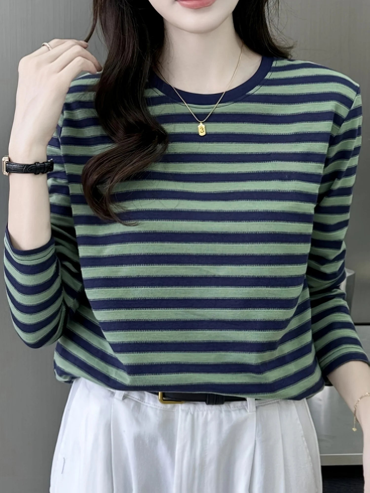 Women's solid color Pullover Striped Crew Neck Sweater, Casual Long Sleeve Pullover Sweater For Spring & Fall, Women's Clothing