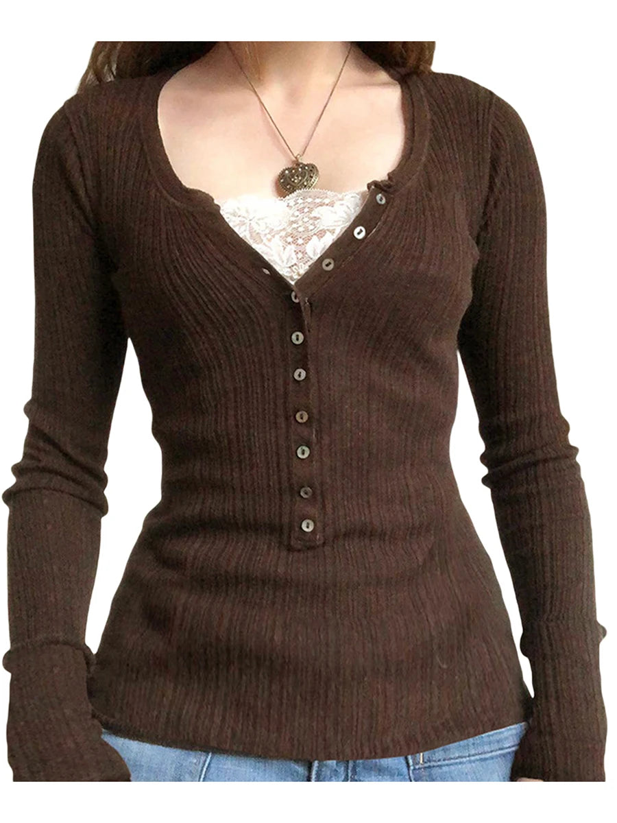 Y2k Vintage Fairy Grunge T-Shirts For Women Long Sleeve Lace Patchwork Collar Buttons Slim Pullovers Aesthetic Clothes