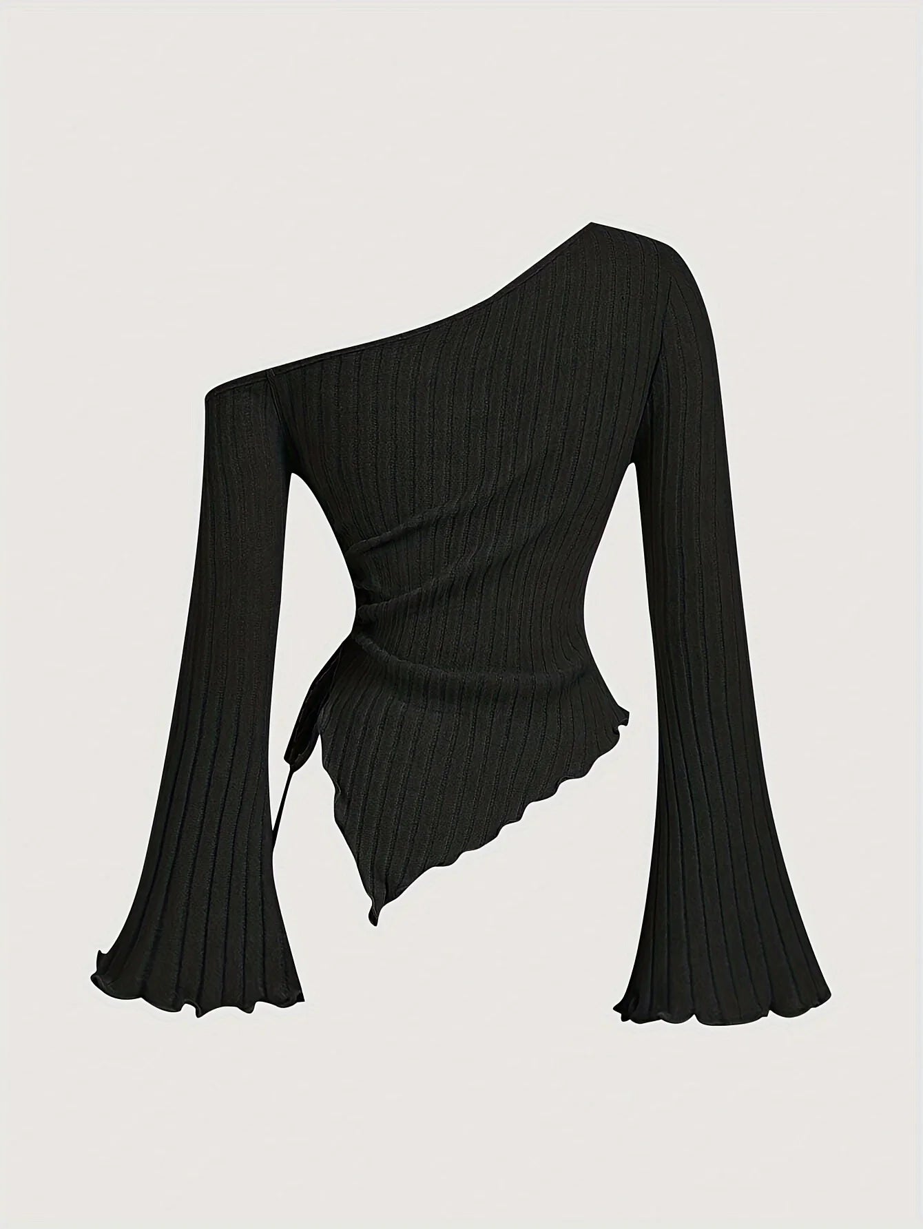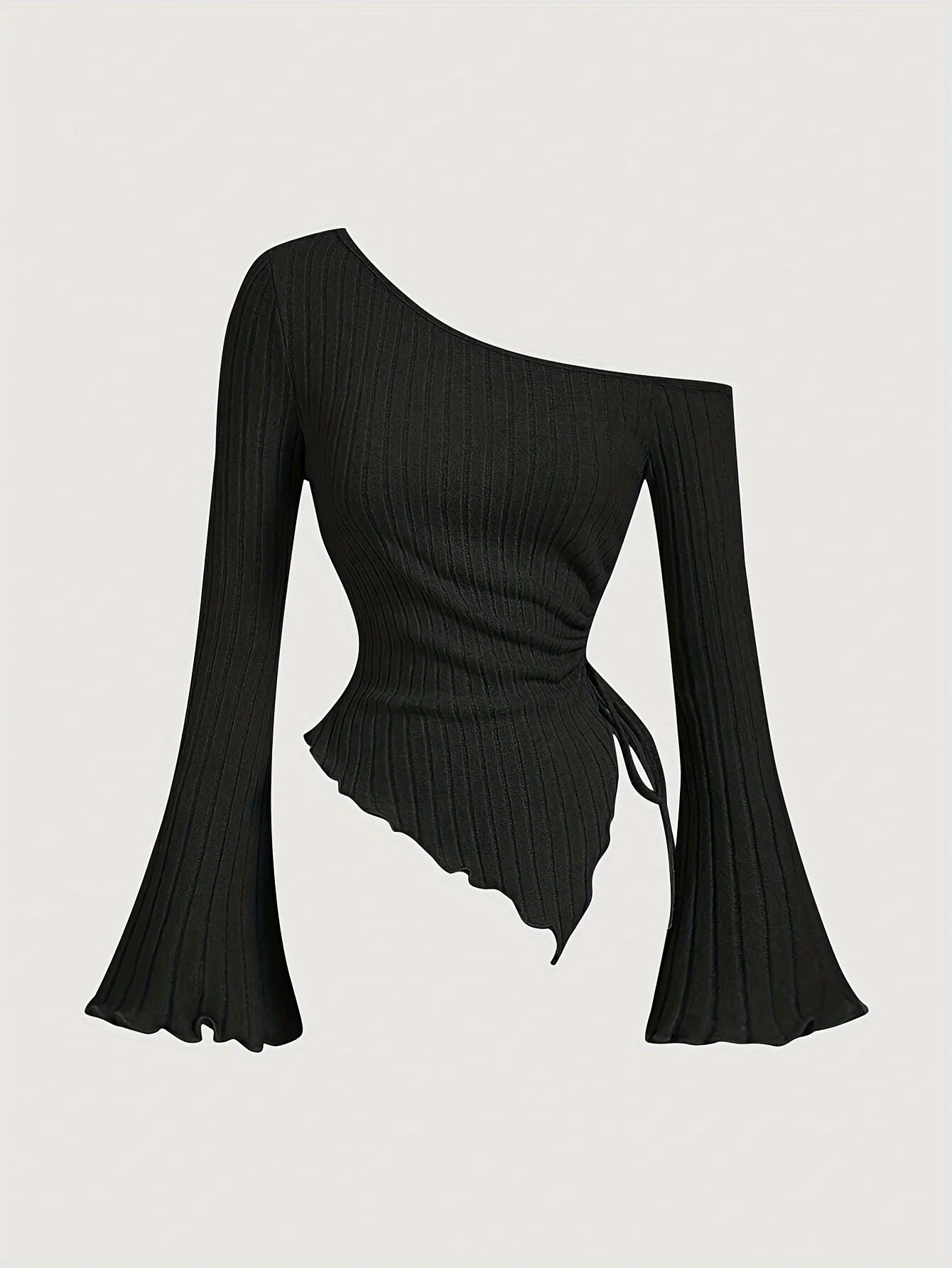 New fashion women's V-neck asymmetric hem design T-shirt off-shoulder drawstring design women's clothing