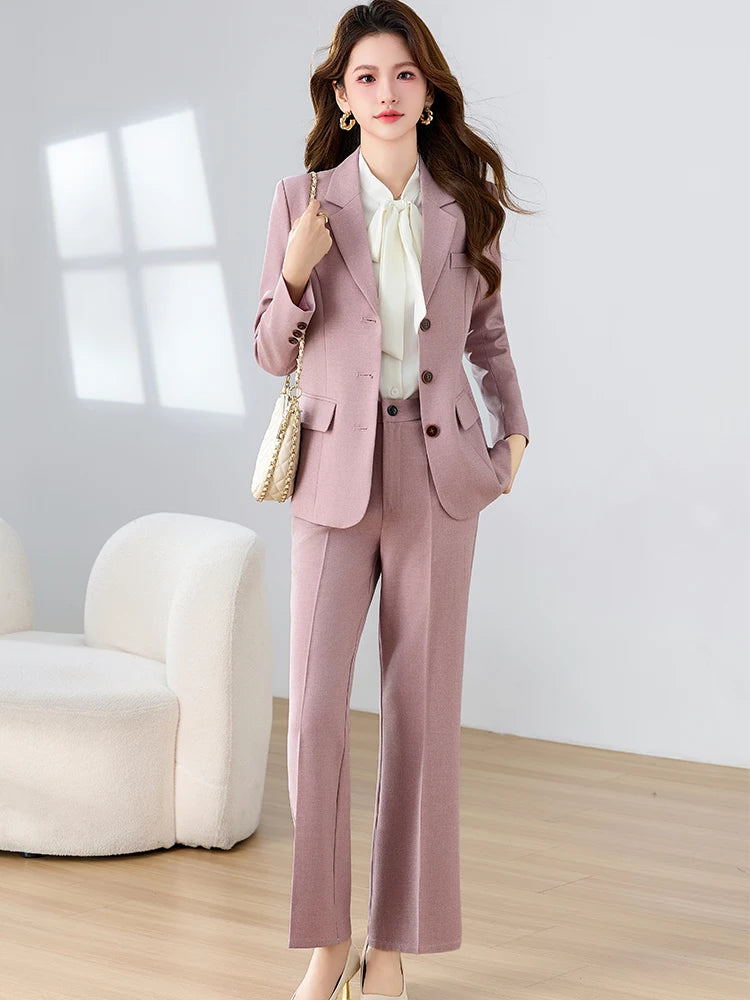 Women's Formal Work Pant Suit Trouser Black Apricot Pink Office Ladies 2 Piece Set Blazer