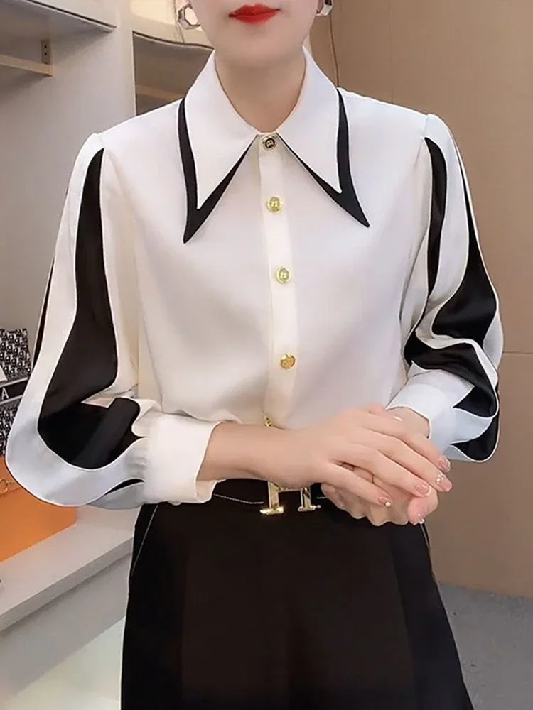 Spring Autumn Women's Pullover Turn-down Collar Rivet Patchwork Solid Button Long Sleeve T-shirt Office Lady Fashion Casual Tops