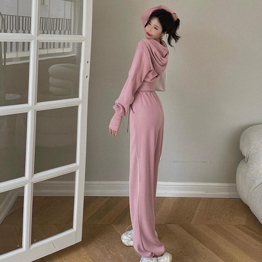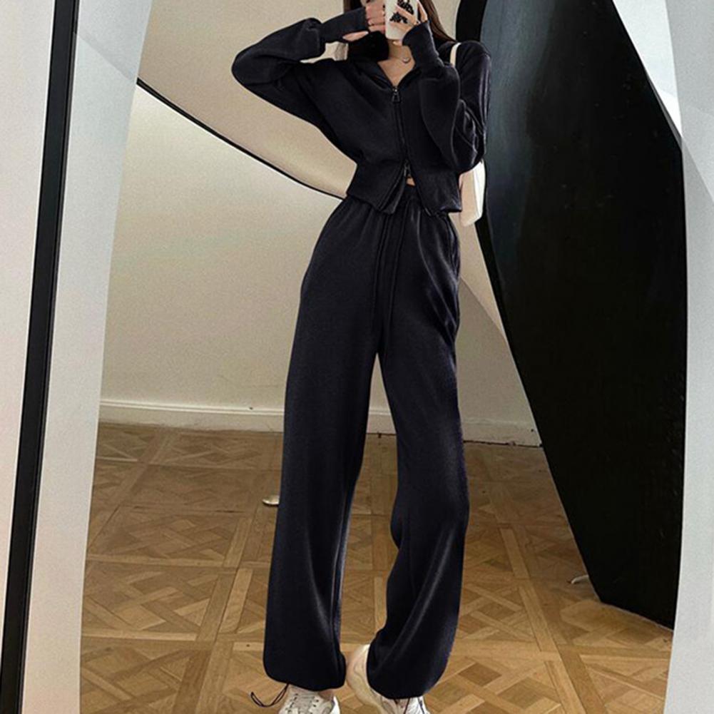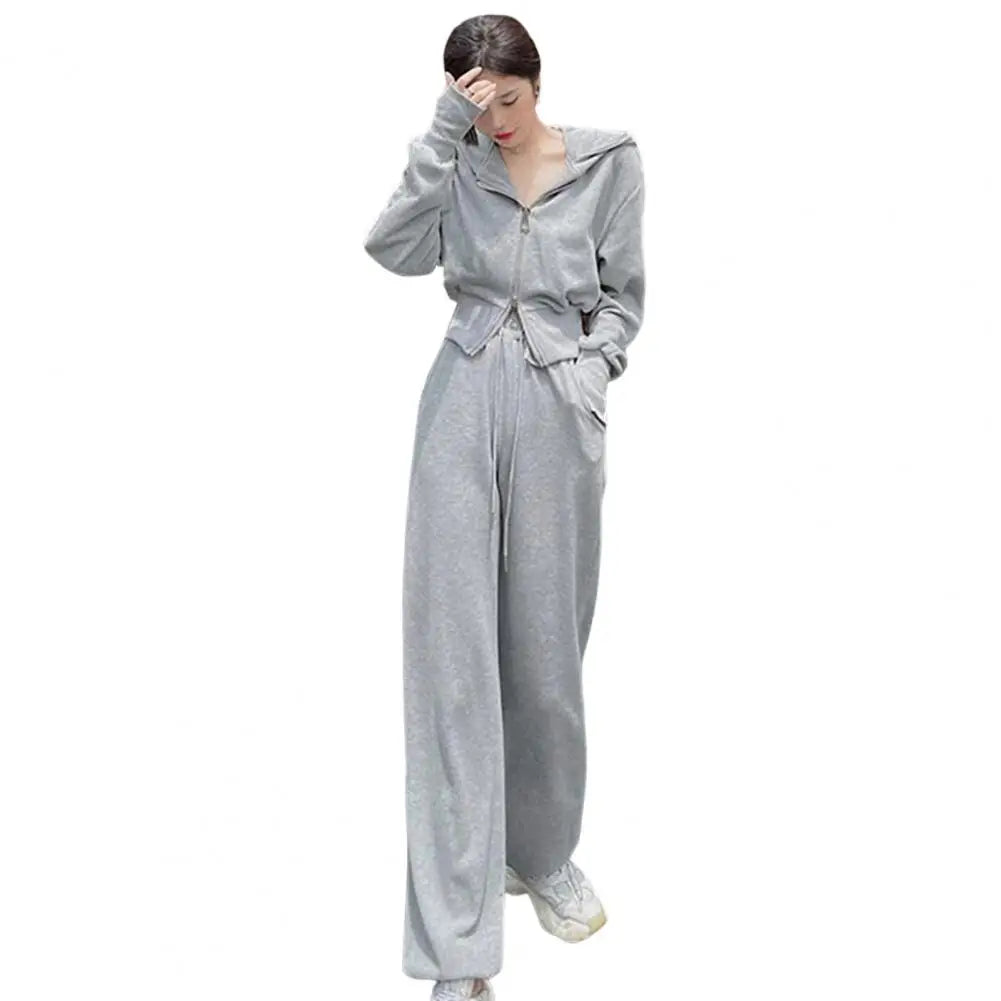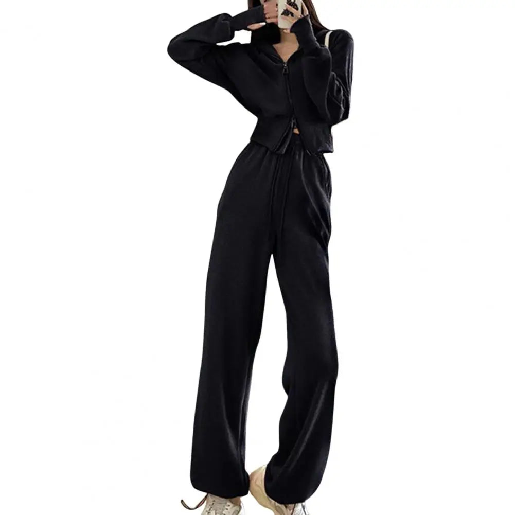 2 Pcs/Set Women Coat Pants Set Double Zippers Long Sleeves Hooded Cardigan Soft Thermal Casual Elastic Waist Women Tracksuit for Sports