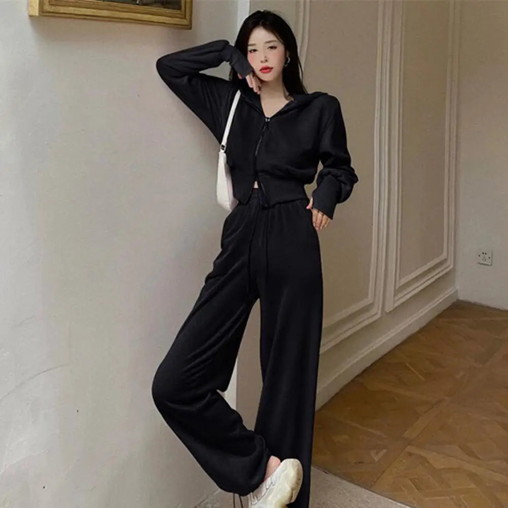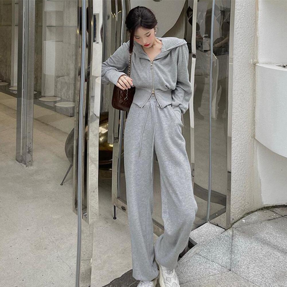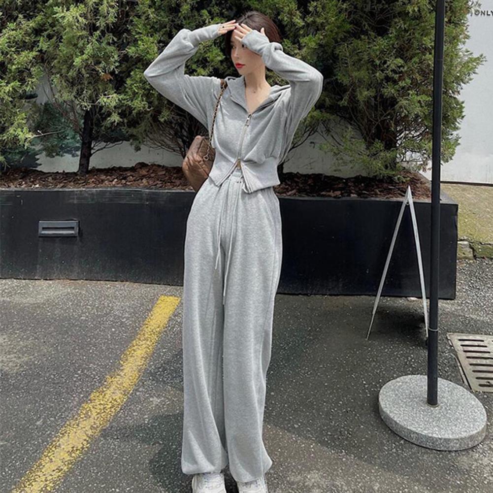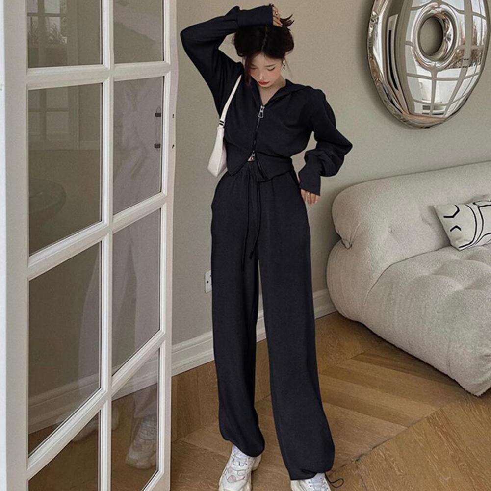2 Pcs/Set Women Coat Pants Set Double Zippers Long Sleeves Hooded Cardigan Soft Thermal Casual Elastic Waist Women Tracksuit for Sports